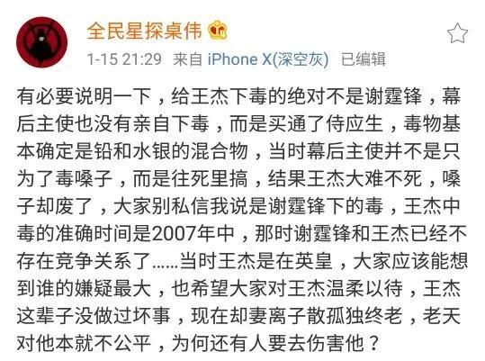 而2016年王杰又在微博上透露自己是在9年前被下毒的,