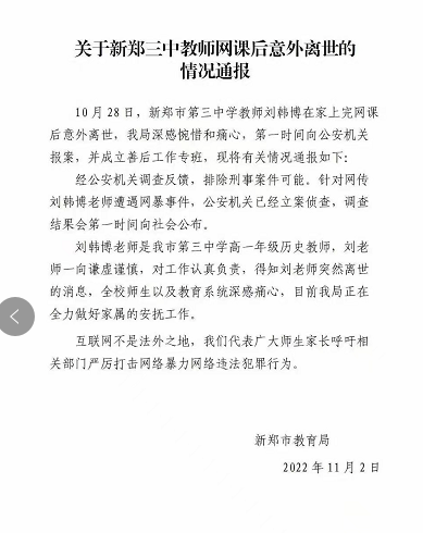 11月1日,有网友上传了新郑三中教师刘某某上网课被网暴的视频,次日凌晨刘某某的女儿发微博称:“家里人已经报案。”随后,其再发微博表示,10月28日,刘某某在结束网络直播课后独自倒在了家里,两天后被发现并确认死亡。同时,该女儿还透露,早在10月中旬开始,逼死其妈妈的网络暴力就已经开始了。