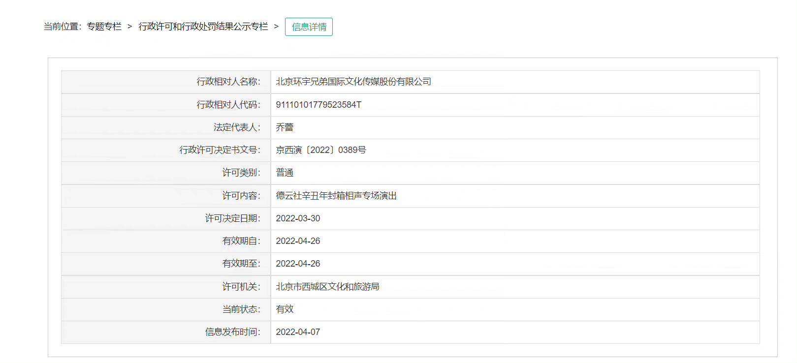 4月7日,距离黄牛放出消息两天。一直负责德云社大型演出的“北京环宇兄弟国际文化传媒”正式获批演出许可公示。